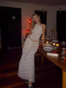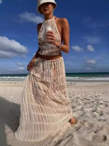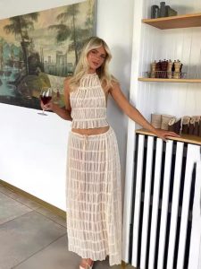 Fashionable and sexy backless halter neck strap pleated chiffon lace vest long skirt suit
