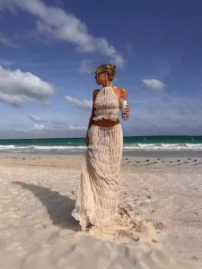 Fashionable and sexy backless halter neck strap pleated chiffon lace vest long skirt suit Fabric name: cotton polyester Pattern: solid […]